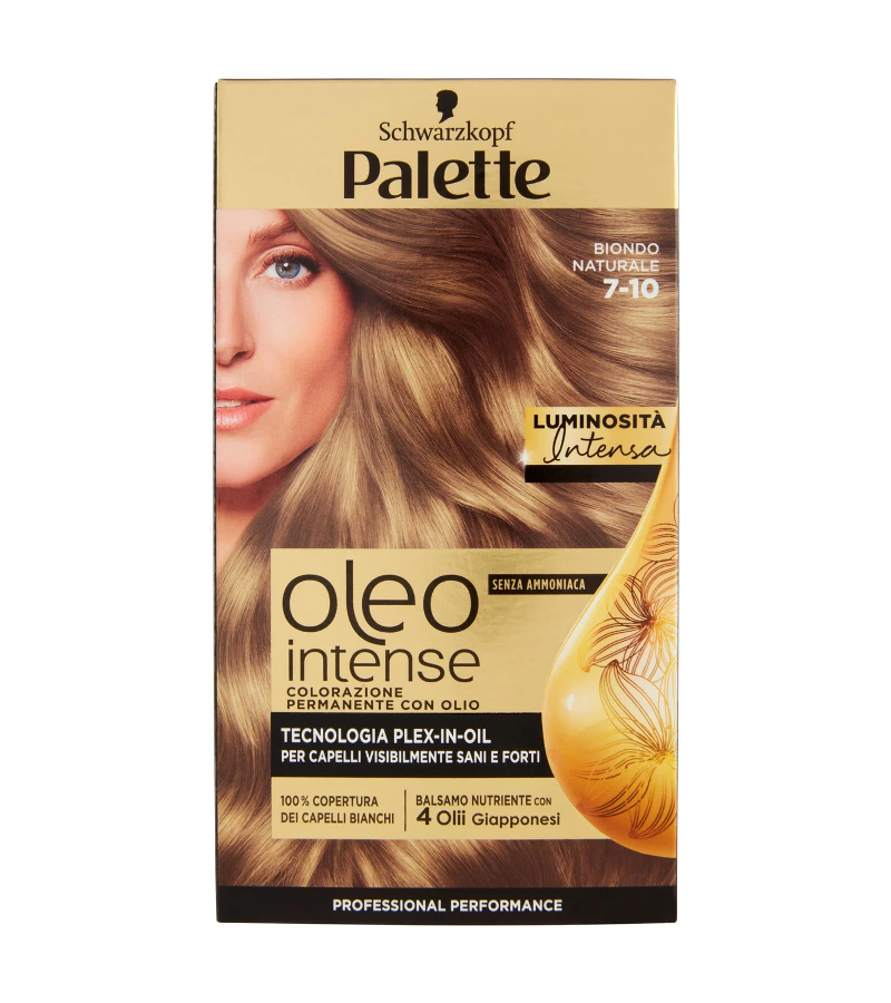 صبغة Palette Intensive Creme Color من ماركة Schwarzkopf، لون 7‑10 أشقر طبيعي، تتميز بتركيبة دائمة تُغطي الشيب بنسبة تصل إلى 100٪ وتدوم حتى 8 أسابيع