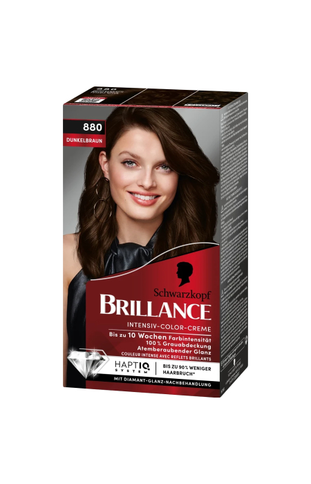 صبغة Brillance Intensive Color Creme 880 Dark Brown من Schwarzkopf – لون بني داكن غني، مثالي للشعر الطبيعي أو المصبوغ الفاتح، يمنح لوناً عميقاً وثباتاً يصل حتى 10 أسابيع مع تغطية كاملة للشيب 100٪